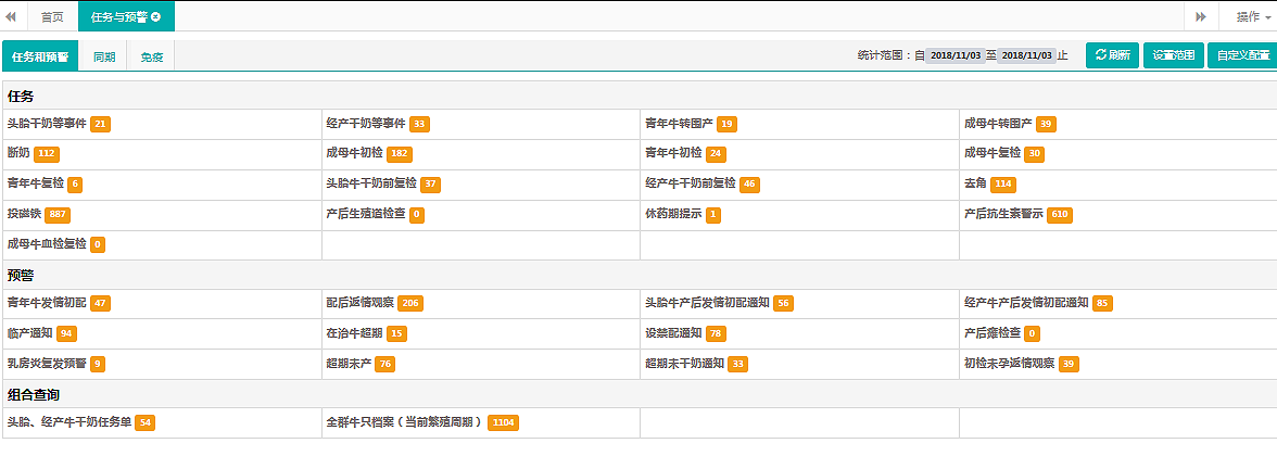 在牧場(chǎng)管理軟件上,管理者可以看到監(jiān)督牛場(chǎng)各項(xiàng)生產(chǎn)任務(wù)的通知和對(duì)部分管理環(huán)節(jié)的預(yù)警,例如斷奶通知、干奶通知、產(chǎn)后配種通知等。這些功能是對(duì)到期應(yīng)開展的具體到牛號(hào)的工作任務(wù)提醒,以督促相關(guān)人員及時(shí)準(zhǔn)確地執(zhí)行,避免延誤造成損失。